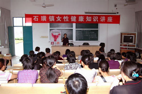 2009年6月11日下午,石璜镇计生协在镇中学阶梯教室举办女性健康知识讲座。石璜镇计生协特邀“健康使者万里行组委”的戴中英教授来我镇讲课。戴教授为育龄妇女讲解了女性生殖器官的解剖构造和常见妇科疾病的自我检查、预防方法、处理措施。这堂课收到育龄妇女的热烈欢迎。