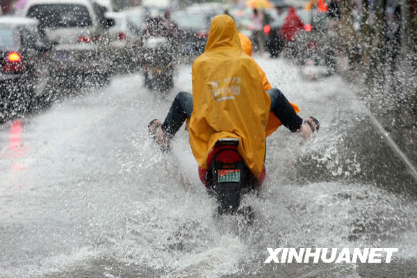6月30日,车辆在积水的南通市街头前行。