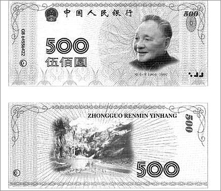 随后,海峡都市报记者在福州某网站上发现了标题为“11月份即将发行新版500元人民币”的帖子。帖子称,今年11月份,将要发行这种500元面额的钞票,帖子里还贴有两张“新版500元人民币”的照片,一张为正面图,上面印有邓小平带着亲切笑容的头像,头像底下还有“邓小平1904—1997”的字样,背面则是一幅河流山谷风景画。