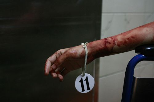 一名女乘客受伤的手臂上挂着标签。本版图片早报记者赵昀