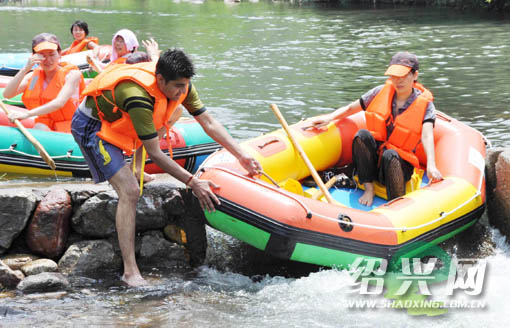 昨日,嵊州市清溪漂流景区内,一位印度游客正热情地为过往游艇导航。当天,嵊州清溪漂流景区首创单日接待游客2000人次的最高纪录,成为今夏首个漂流“井喷”日。景区还迎来了一个印度旅游团队,这位不愿透露姓名的印度游客就是这个团队的成员之一。 (来源:绍兴网)