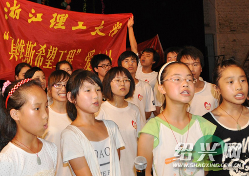 昨晚,由浙江理工大学社会实践的大学生与当地结对的贫困学生组合而成的“希望”乐队,在嵊州市下王镇为四明山抗日根据地的老区群众,献演了一台精彩的文艺节目。图为演出现场。(来源:绍兴网)