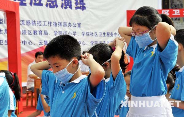 2009年7月6日 湖北宜昌举行暑期甲型H1N1流感防控应急演练 7月6日,宜昌市学院街小学的学生在演练中戴口罩。 新华社发(黄翔 摄)