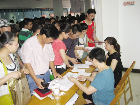 7月11日,市人才市场报名大厅内人头攒动(如图),前来报考村官的大学生排起了长龙。报名结束后统计,全市共有865名大学毕业生报考68个村官岗位,考录比例超过12:1。据悉,考试采用笔试和面试相结合的方法,笔试和面试成绩各占综合成绩的50%。笔试时间全市统一定于2009年7月26日上午9:00-11:30。