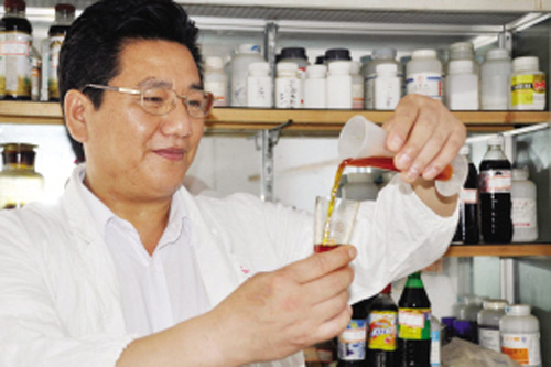 嵊州五旬农民陈伯荣在自己2平方米的实验室里,经历27年研究出的《碱性新型环保电镀工艺》专利成果,在今年5月举行的北京国际科技产业博览会上公布。因其镀液配方在国际学术界尚无资料可查,加上节能、环保的特色,得到国内这一行业化工专家的好评。图为7月7日,陈伯荣在实验室配比碱性新型环保电镀液的现场。