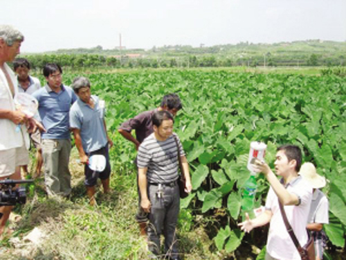 近日,绍兴市农业局蔬菜技术推广站专家叶国华等,带着200只可管辖有效捕虫面积300亩、专门捕捉早芋艿主要害虫斜纹夜蛾的“性诱剂”,到灵溪村为数十户早芋艿种植大户进行捕捉现场安装示范。据介绍,这次安装的“性诱剂”捕虫器,会散发一种特殊的气味,雄虫闻到后,就会拼命往捕虫器里钻,钻进的雄虫就被杀死在捕虫器里,这样就阻断了斜纹夜蛾繁殖条件,保护了早芋艿。