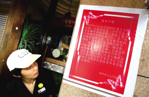 浙江在线07月14日讯 这几天,大家要是去温州市区OPPO咖啡馆,一进门就会看到一份声明——不要以不正当商业行为到本店盗取菜单……“这几天两家门店菜单接连失踪,不得不贴声明告知(见上图)。”温州欧柏餐饮管理有限公司总经理助理郭绪珍无奈表示。