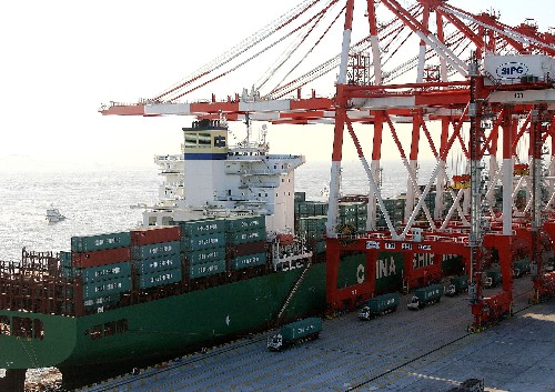 上海市洋山深水港码头,集装箱船舶在繁忙作业(2008年12月6日摄)。新华社记者 陈飞 摄