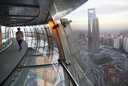 7月13日,一名游客在东方明珠电视塔观光厅内欣赏陆家嘴金融区景色。 新华社记者 裴鑫 摄
