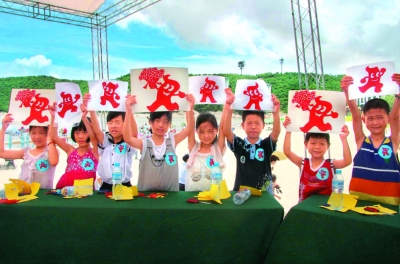 在宁波宣传周上,小朋友举着自己创作的“海宝剪纸”。