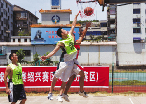 昨日上午,2009浙江体彩三人篮球超霸赛嵊州分赛区比赛在嵊州中学操场举行。18支球队分普通组和青少年组进行了比赛。经过26场激烈的角逐,比赛决出了普通组和青少年组的冠军。他们将于7月下旬代表嵊州参加绍兴赛区的决赛。图为比赛现场。