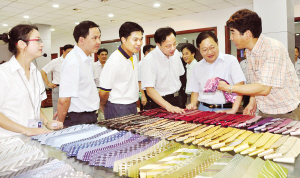 7月15日下午,郭敏、何加顺、盛秋平、温暖等嵊州市和新昌县党政主要领导在达利丝绸(浙江)有限公司老总(右一)林平的陪同下,参观了达利丝绸精品展厅。嵊州、新昌两县(市)的党政领导交流了两地工作情况,就进一步推进嵊新区域集约发展交换了意见。 (来源:绍兴网)