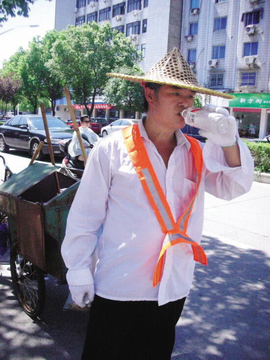 昨天,李师傅从早上4时就忙开了,来回不停地清扫,才换来了路面的洁净。问他在烈日下工作是否吃得消,他回答:“头顶太阳晒着,脚下被热气烤着,不热是假的,但我们‘庄稼人’习惯了。”李师傅拿出了一瓶矿泉水,一口气“咕咚咕咚”全喝了下去。这些天,他每天要喝下不少水。