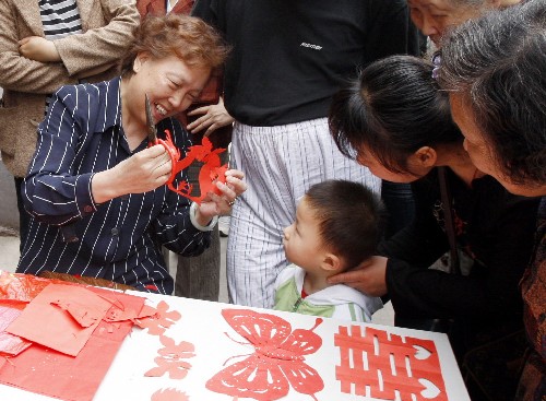 上海卢湾区里弄一位阿婆在为孩子剪纸(5月17日摄)。 新华社记者 张明 摄