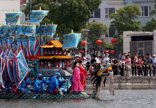 在上海宝山罗店端午龙船文化节上,群众正在观看龙船表演(5月28日摄)。 新华社记者 张明 摄