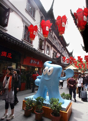 上海豫园端午文化节上,游客在和“海宝”合影(5月26日摄)。 新华社记者 刘颖 摄
