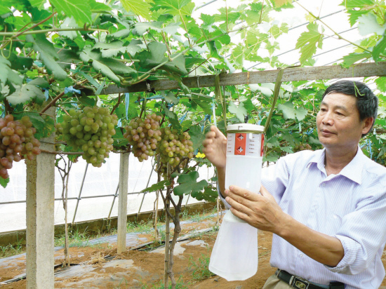 为有效防治斜纹夜蛾危害,确保葡萄生态安全,市丰尼果蔬科技示范园采用生物防治技术,在精品葡萄区首次安装了性引诱剂诱捕器,诱捕斜纹夜蛾。图为技术人员在安装诱捕器。