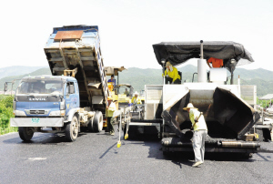 沥青路面烫脚踏着热浪施工