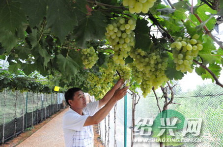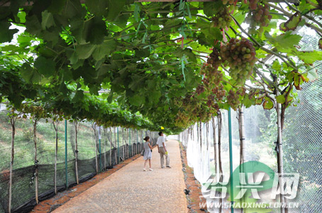 7月23日,嵊州市丰尼水果基地里拍摄的千米浙东第一葡萄观光长廊。嵊州市是中国浙东唐诗之路最精华的城市之一,该市以唐诗之路的文化捉进了精品水果的采摘旅游,成为浙东休闲旅游的一大亮点,形成了嵊州旅游的新品牌。(来源:绍兴网)