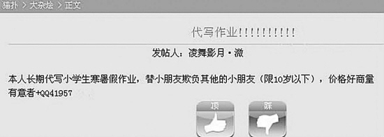 正在上初二的赵同学说:“暑假天大热,作业量大,还要参加各种补习班,实在没时间也没有兴趣去做了。但是不做作业,开学又不好交代,所以会去找枪手帮忙,反正价格还过得去。”“当然更多的同学,只是好奇去问,没敢真的叫枪手代写。”他补充说。