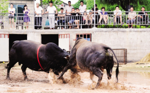 昨天,嵊州市剡溪渔业园农家乐景区邀请附近养牛户把家中闲散的耕牛聚集在一起,进行了一场斗牛比赛,引来了许多游客的观看。据主办方介绍,这些耕牛农忙时耕田,农闲时斗牛,已成为当地农家乐休闲景区的一大卖点。 (来源:绍兴网)