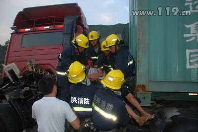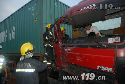 当天凌晨4时50分,嵊州市消防大队接到群众报警声称:甬金高速金华往宁波方向58K+700M处(嵊州段)发生一起两车追尾事故,有多人在事故中受伤,现在还有一人被卡在车里,请快点来救人。接警后,该大队立即出动两辆消防车、10名官兵火速赶赴现场处置。消防官兵到达现场后,发现一辆宁波牌照集装箱货车停在超车道上,车头严重变形并向右偏离90度,驾驶室内一男子紧紧抱着副驾驶座上的受伤女子,地上到处是散落的玻璃碎片。在集装箱货车后前面(匝道上)则停着一辆金华永康牌照的大货车,货车尾部严重受伤,车上货物散落一地。据现场高速交警介绍,追尾集装箱货车上共有4人,抱着副驾驶座上受伤女子的男子是驾驶员,后座上原先还有两名小孩,现已送往医院救治;牌照为浙江金华永康牌照的大货车有2人,也已送往医院救治。