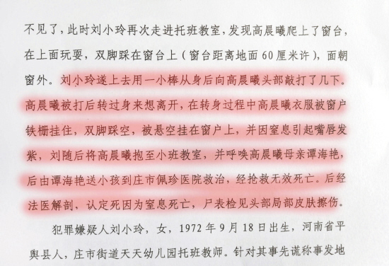 刘小玲走到窗户边,伸手用教棒又在小晨曦头上打了几下。小晨曦被打转身就想躲开,但他的衣服一下子被铁栅栏勾住,双脚悬空了。
