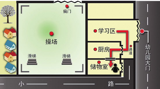 事发后,有人猜测小晨曦就是循着图中的红色路线进入储物室的。 梁津铭 制图
