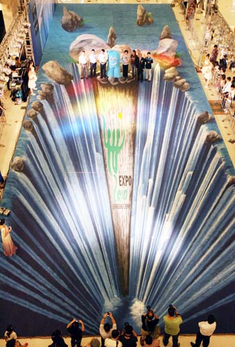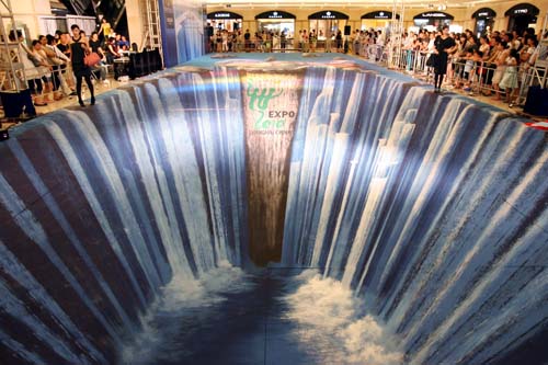 新华网上海频道8月6日报道:8月5日,模特在巨幅3D立体画上的“瀑布”旁走秀。当日,世界最大3D立体画在上海静安区梅龙镇广场亮相。这幅以2010上海世博会为主题的3D立体画由世界最大面积3D画纪录保持者Edgar Müller精心打造,画面以湍急的瀑布为背景,融入了世博会会徽等世博元素,效果逼真、极富视觉冲击力。整幅3D画卷达300平米之巨,超过了由Müller先生本人保持的世界最大3D画280平米的纪录。