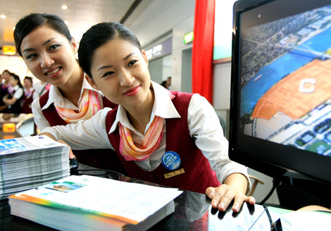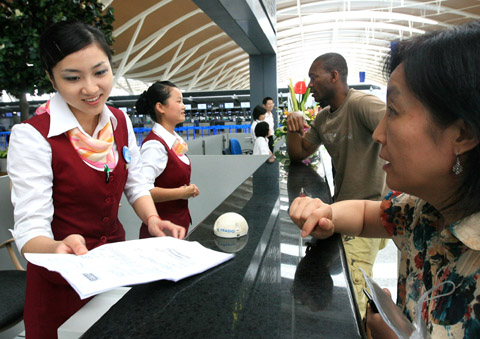 新华网上海频道8月6日报道:8月5日,上海浦东国际机场优质服务品牌“翔音问讯”处的员工正在为中外旅客提供服务。当日,上海机场(集团)有限公司与上海世博会事务协调局在上海浦东国际机场举行了共建“世博宣传第一窗口”启动仪式,此举旨在向进出上海的旅客生动演绎“城市,让生活更美好”的世博会主题,最大限度地放大2010年中国上海世博会宣传效应。据预测,明年上海世博会期间将有7000万人次的参观者,其中有一半人次将乘坐飞机前来上海。 苏巍巍 新华社记者陈飞摄影报道