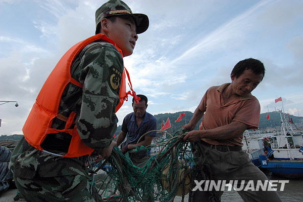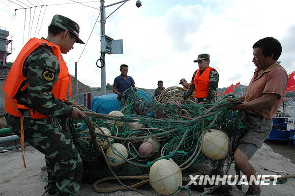 8月5日,温州边防支队官兵在洞头港帮助渔民搬运渔网渔具。