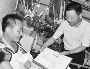 昨日,嵊州市政法委、市见义勇为奖励协会分别授予赵剡祥、杜强、王镇3位市民见义勇为先进分子称号,并送上慰问金和证书。8月2日晚,嵊州市中心最热闹的北直街发生一起夺包案,两位与受害者素不相识的市民赵剡祥、杜强挺身而出,与持刀歹徒搏斗,均受刀伤。随后又有一位市民王镇挺身而出,拦截歹徒,并从歹徒手中夺回了被抢的包。 (来源:绍兴网)