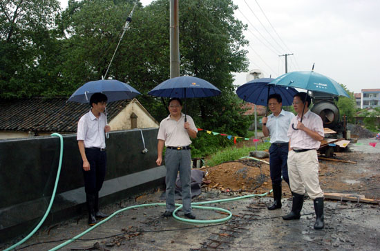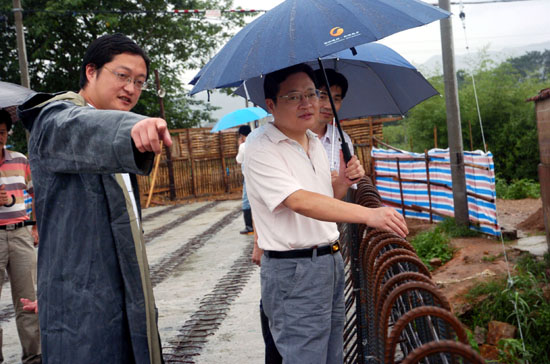 雨刷刷地下着,郭敏一行踏着泥泞先后来到剡北桥和前王坑这两个在建工程。望着滚滚的洪水,郭敏关切地向甘霖镇领导询问巡查人员是否落实,防洪措施做得怎么样。