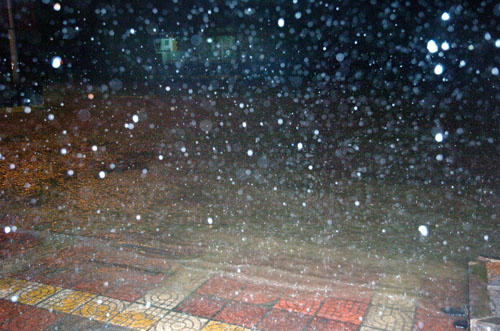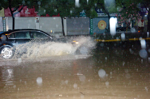 由于“莫拉克”台风的影响,市区下起了大雨。今天晚上9点10分,记者在官河路市农村合作银行路段看到,这里积水严重,大水漫过了人行道,远远望去几乎成了泽国。车辆开过,就卷起1米多高的浪来。自行车和电动车吃力地在水里行进。
