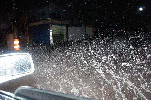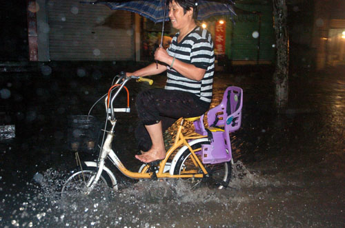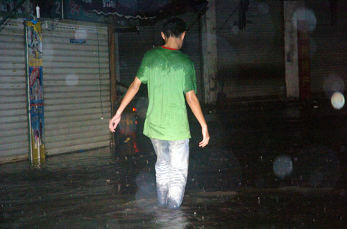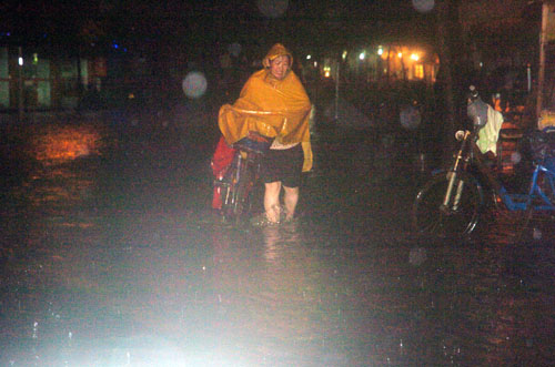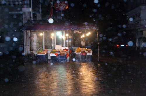 城中市场前也是一片汪洋,摊主无奈地等着顾客