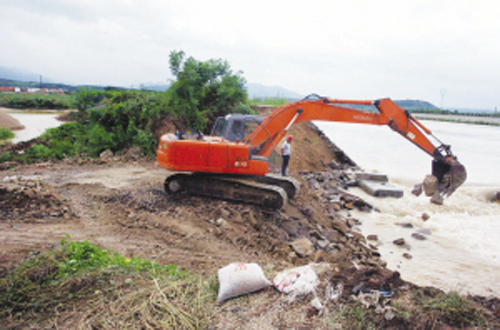 8月9日,黄泽江小横坝出现险情,堤坝被汹涌的江水冲出一个7米的大口子,随时有可能决堤。黄泽镇政府积极组织力量抢险。到昨日凌晨,险情基本得到控制。昨天白天,抢修工作还在继续进行,图为抢修现场。