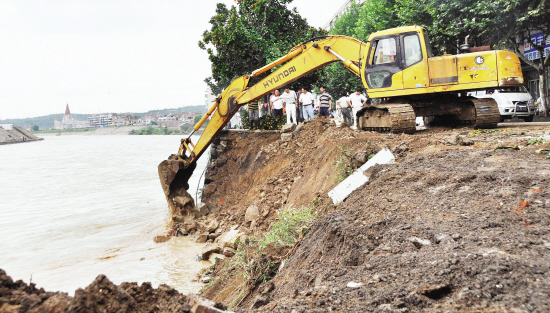 8月10日上午,嵊州市江滨西路的一段剡溪河堤出现坍塌,影响了江滨西路由西向东的通行,该市采取抛石修堤的应急措施,对坍塌处进行抛石修筑。图为昨日下午抛石修筑现场。 (来源:绍兴网)