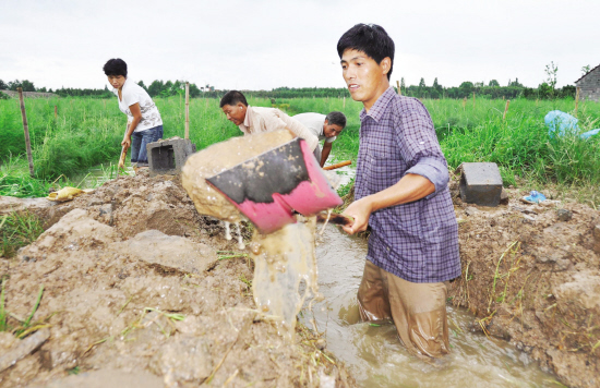 10日上午暴涨的洪水,淹没了嵊州市里湖芦笋专业合作社今年刚种的芦笋苗。据悉,芦笋单次浸泡水中不能超过24个小时,合作社技术员张忠宾(前)力劝大家不要灰心,带头挖渠排水。 (来源:绍兴网)
