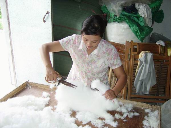 月有阴阳圆缺,水有潮起潮落。低走了三年的兔毛市场,近日又遇回春暖。三年来,兔毛市场一直处于每公斤100元的低价,使得许多养兔专业户难保成本的局面。面对市场的低潮,地处黄泽镇青石桥村的嵊州市华兴兔业养殖场内的许多养殖大户们,沉着冷静,更以科学的态度,在精选优良兔种的同时,积极采集、利用当地农户废弃的番薯藤、玉米杆、花生杆……自己动手制作成颗粒饲料,以求在无奈之际努力降低成本,迎接“春天”的再次到来。如今兔毛价已涨到每公斤140元左右,久“寒”了的养兔大户们终于又可透了一口气。图为嵊州市华兴兔业养殖大户、畜牧技术员沈玉恩在剪兔毛准备出售。