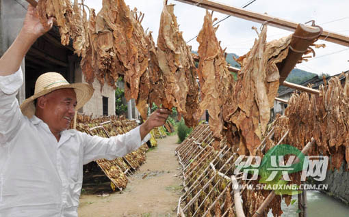 昨天,嵊州市贵门乡的农民正在晾晒香料烟。茶叶、烟叶是贵门乡的主要经济作物之一,前几天的连日阴雨,给贵门乡2500余亩烟草带来了100多万元的损失。昨天天一放晴,农民们马上翻晒烟叶。 (来源: 绍兴网-绍兴日报)