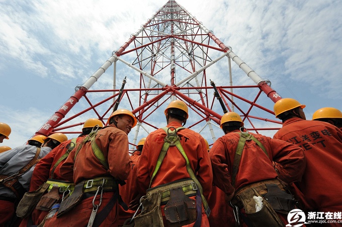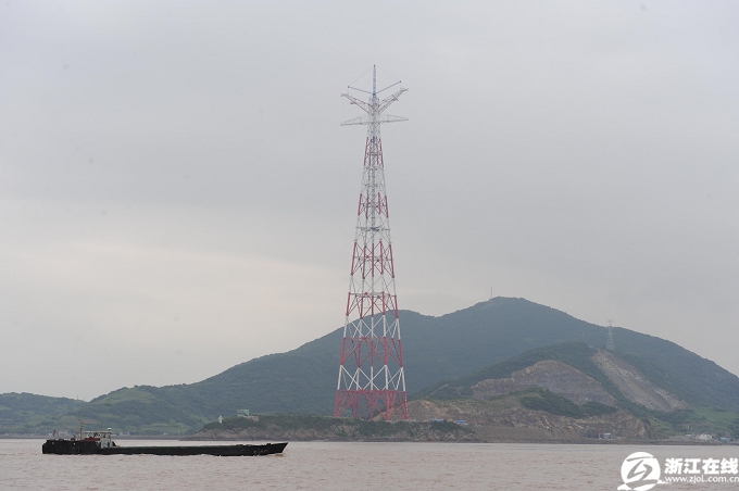 今天,经过600多天的紧张施工,世界第一输电高塔在浙江省舟山市大猫山顺利结顶。塔重5999吨,其单基塔高和塔重均居世界输电铁塔之最。塔高370米,比巴黎埃菲尔铁塔高出近50米,相当于普通楼房的120余层。这座世界第一的输电高塔,改写了电力建设史上多项国内外纪录。220千伏舟山至大陆跨海联网工程建成后,将有60万千瓦电力源源不断地从浙江大陆流往舟山,相当于现用海底电缆输送容量的6倍,也是舟山目前总装机容量的2倍多,将从根本上解决舟山电力供需矛盾。