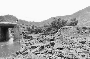昨天上午9时,记者在嵊州方贵线溪口段拍摄的掏空路面。据悉,今年第8号台风造成嵊州方贵线溪口段被江水掏空,路面只剩下一根铁护栏相接,该路段目前已造成嵊州里南乡和贵门乡群众通行困难,而且当地交通部门没有在主要的连接路口设置禁行通告。当地群众希望交通部门尽快抢修。 (来源:绍兴网)