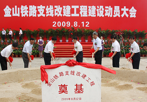 新华网上海频道陈飞8月14报道:8月12日,由铁道部和上海市共同出资、列入上海市重大工程建设项目的上海金山铁路支线改建工程动员大会在上海金山区隆重举行。金山铁路支线改建工程从上海南站引出至金山客站,全长56.4公里,途经上海市徐汇、闵行、松江、金山四个区,共设上海南、莘庄、春申、新桥、闵行西、叶榭、亭林、阮巷、金山等9个车站。工程总投资48亿元,建设工期二年。建成通车后,从上海南站到金山站,只需要半小时左右的时间,将成为上海市中心城区连接金山区的一条快速铁路,全国的第一条快速市郊铁路。平贵书 新华社记者陈飞摄影