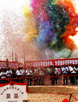 8月12日,铁路支线改建工程奠基仪式现场充满喜庆的气氛。