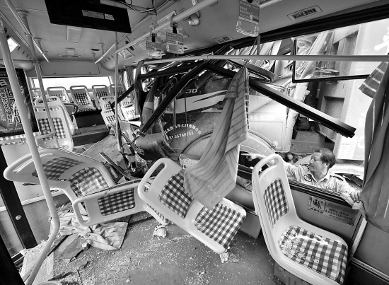 车祸后,公交车内一片狼藉。记者 盛高 摄