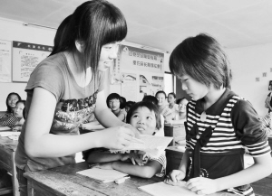 8月12日,嵊州市贵门乡玠溪村党员电化教室里山村娃正在学英语。玠溪村是当地海拔500米的高山村,为丰富山村孩子的暑假生活,村干部请来宁波工程学院学生,利用党员电化教室,为该村50余名山区学生义务辅导英语。 (来源:绍兴网)