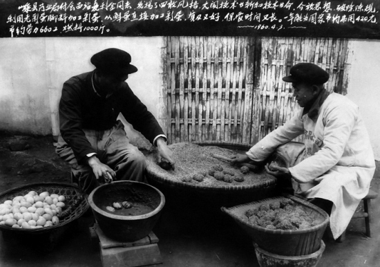 图为1960年4月,嵊县商业局副食品站夏利金利用老彩蛋脚料加工彩蛋。其加工的彩蛋质量好,保存时间长,一年能为国家节约费用420元,节约劳力660工,节约燃料500公斤。