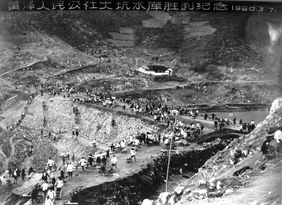 新中国成立以来,党和政府始终把水利作为国计民生的头等大事,水利事业取得了前所未有的新进展。图为1960年3月黄泽人民公社大坑水库建设场景。
