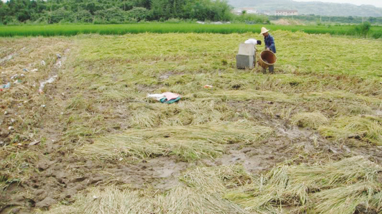 黄泽镇白泥坎村100多亩中熟水稻正当开始收割之际,遭遇台风“莫拉克”,造成了稻秆倒伏,还有许多稻穗已发芽。连日来,农户们积极开展生产自救,正在争分夺秒地抓紧时间收割,争取减少损失。