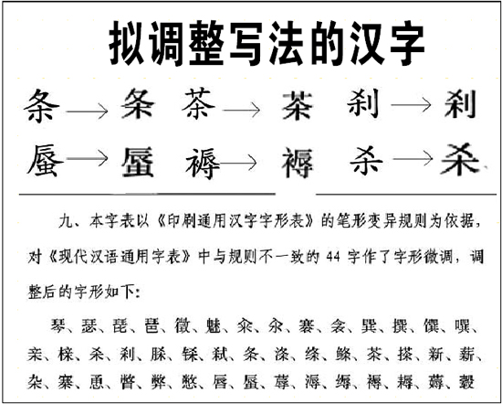 此外,字表对宋体字形进行了规范,依据《印刷通用汉字字形表》总结和制定了字形规则,对一些不符合字形规则的字的字形作了微调。字形调整的原则是:尊重汉字结构,遵循统一规则,严格控制特例。